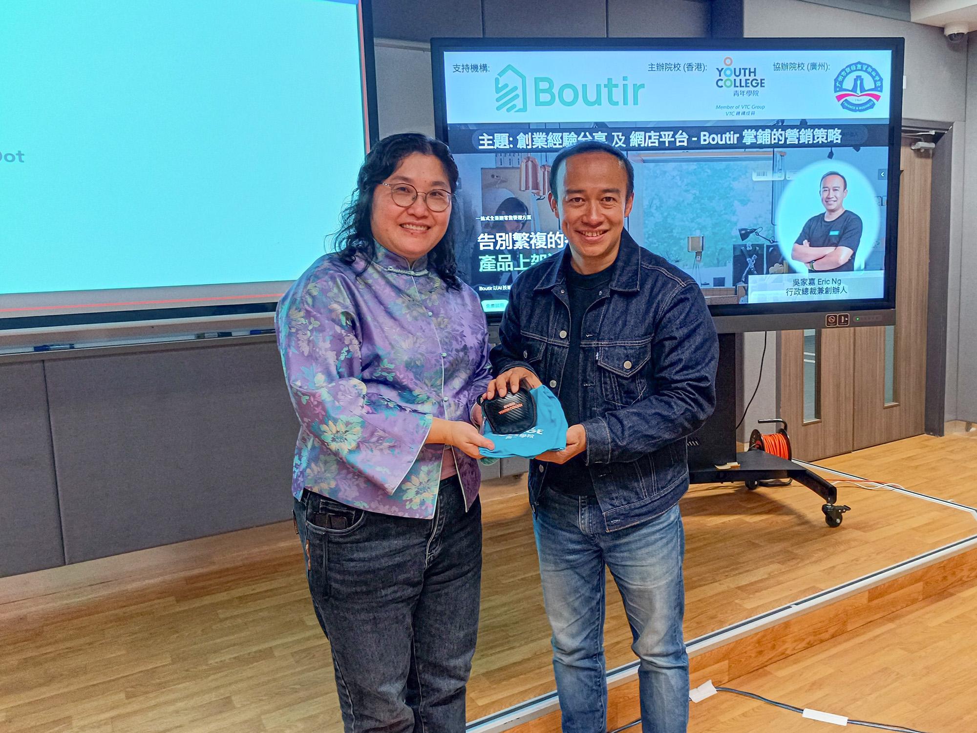 Organized by the Diploma of Vocational Education (Business) and (Business Event and Marketing) teams, and co-organized by the Guangzhou Vocational School of Finance and Business, the "Sharing of Entrepreneurship and Marketing Strategy of Online Store Platforms – Boutir" was successfully conducted at Youth College (Kwai Fong) on February 12, 2025.
