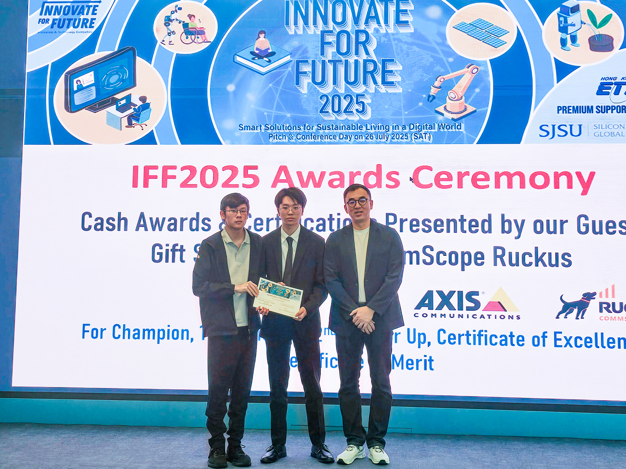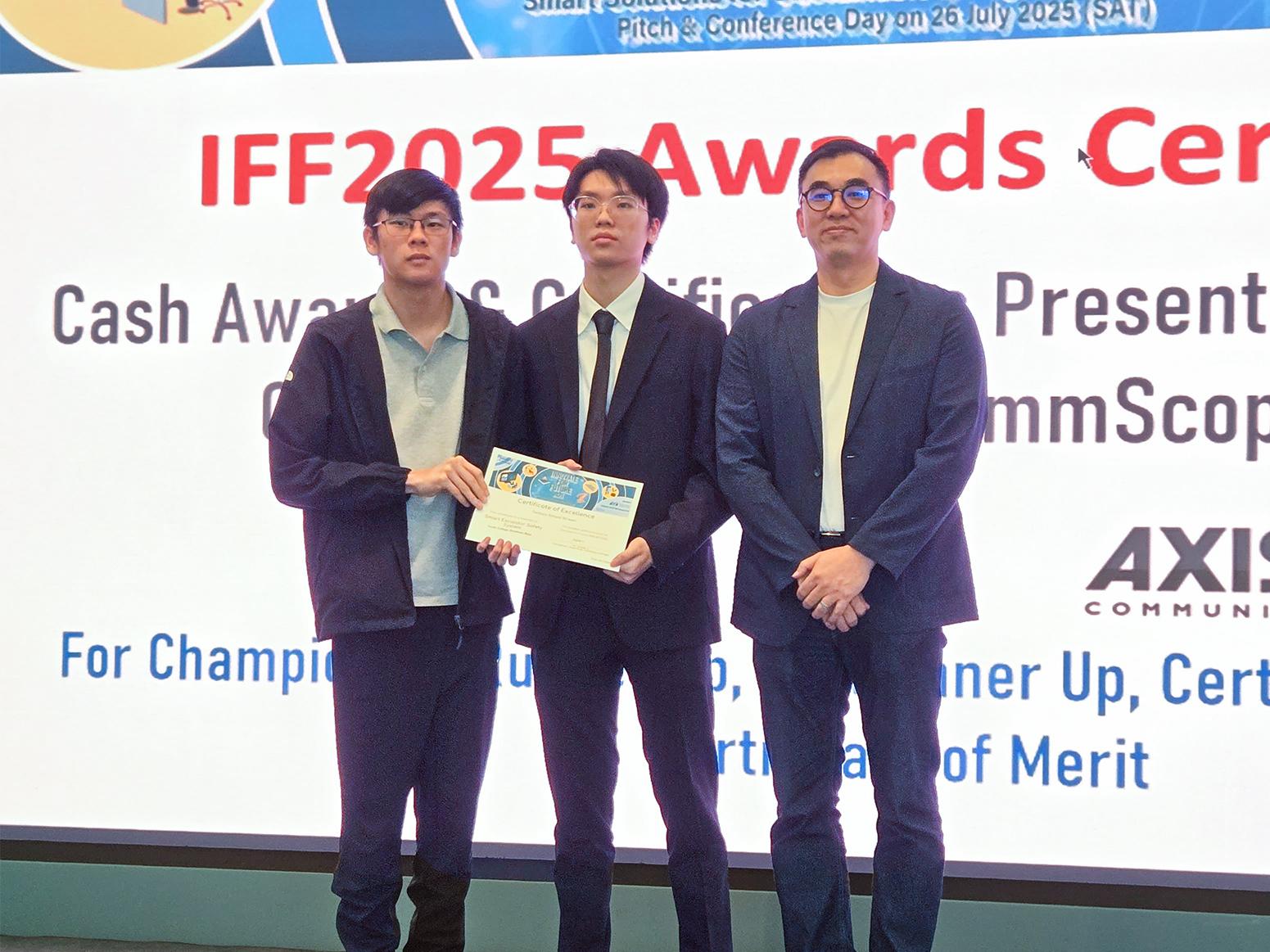 “Smart Escalator Safety System”, the entry by student Tao Ernie and CHAN Yat Fung from Diploma of Vocational Education (Electronic and Computer Engineering) of Youth College (Kowloon Bay) was awarded the "Certificate of Excellence" in the Tertiary Group of the Innovate for Future (IFF) Competition 2025.