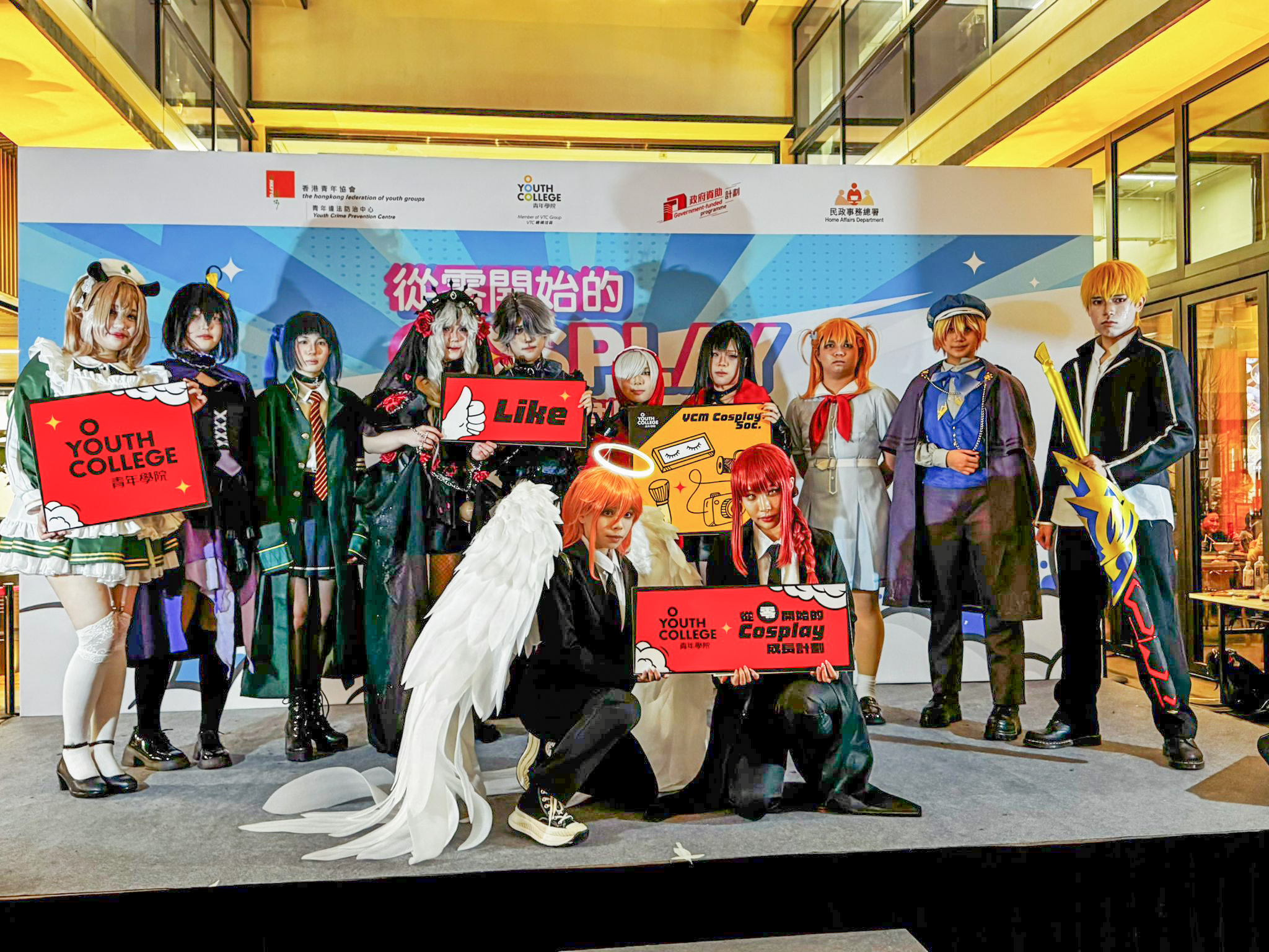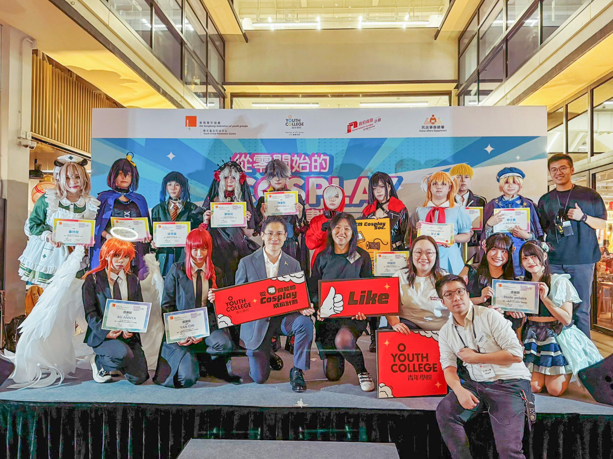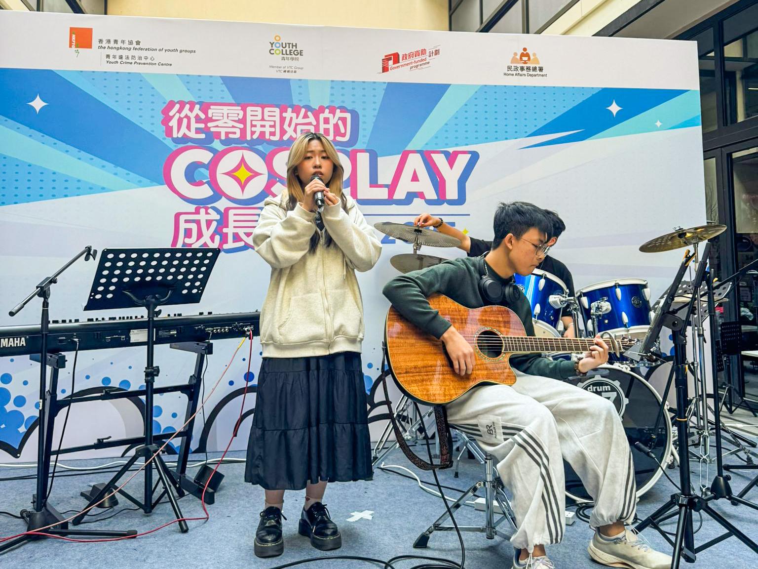 Youth College (Yeo Chei Man), in collaboration with the HKFYG Youth Crime Prevention Centre (YCPC) and the Sai Kung and Wong Tai Sin Outreach Social Work Teams, received funding from the Home Affairs Department's 2025-26 Sai Kung District Youth Development Programme. From September to November 2025, they jointly organized the "Cosplay Growth Programme." Throughout the programme, 11 participants engaged in a series of workshops, including props and wig making, social media operations, Cosplay stage photography, and performance techniques. To allow the public to gain a deeper understanding of the students' achievements, a results exhibition was held on 23 November 2025 at the Oasis, G/F, Central Market. The programme involved students from the following Diploma of Vocational Education (DVE) programmes: DVE (Music and Media Production), DVE (Image Design), DVE (AI and Information Technology), DVE (Beauty Care), DVE (Fitness and Sports Studies), and DVE (Hairdressing).