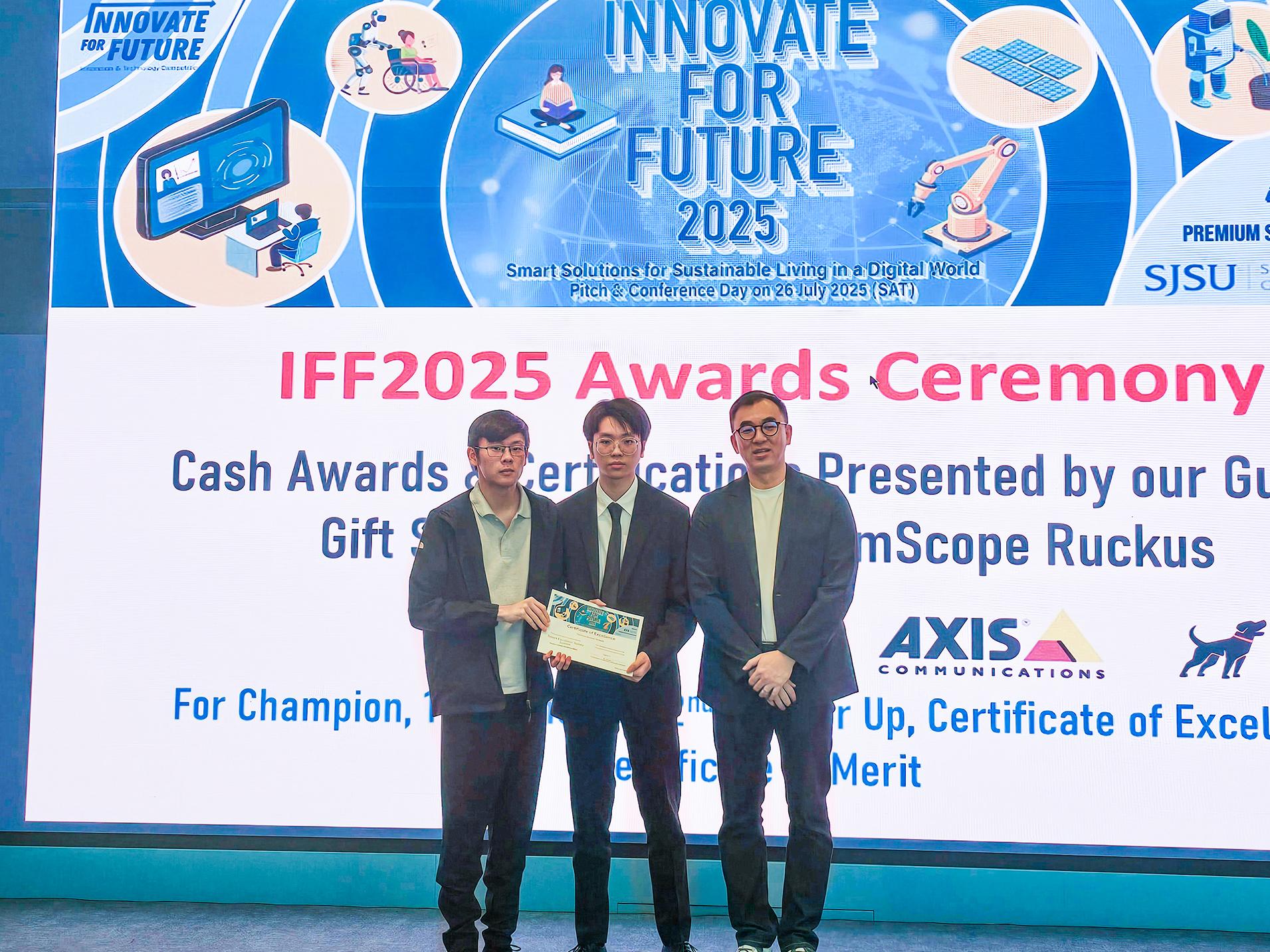青年学院(九龙湾)职专文凭 (电子及电脑工程) 学生杜卓桓 和陈溢锋之参赛作品“智慧扶手梯安全系统”荣获Innovate for Future (IFF) Competition 2025大专组别的「卓越证书」。