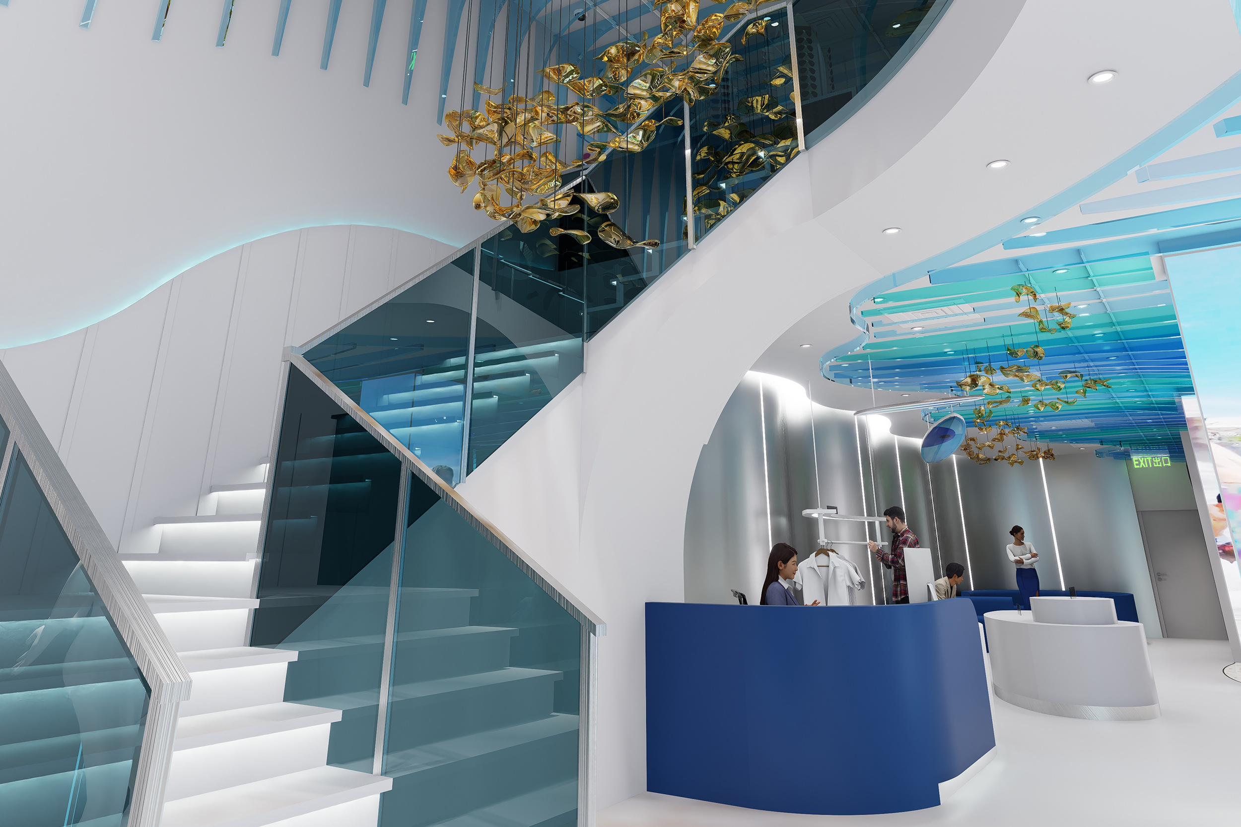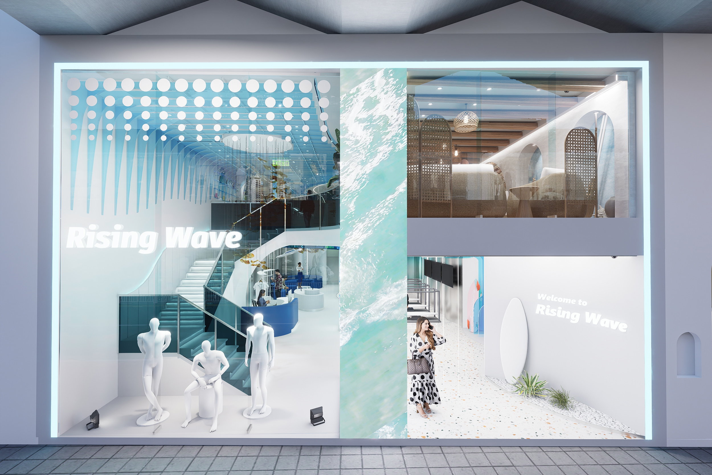 陳恩華分享:「這間位於香港繁忙商業區的兩層衝浪用品店,外觀以海浪為靈感,採用藍白主色,並融入度假元素及仿沙灘地面,營造悠閒的氛圍。店內運用波浪形材料打造簡約流動的空間,設有VR衝浪體驗區、展覽空間及咖啡廳。設計旨在帶來難得的放鬆空間,與繁忙都市形成對比,並推廣香港相對小眾的衝浪運動與文化。」